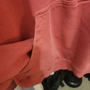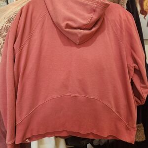 Cozy coral hoodie with half-zip design. Ideal for layering and casual wear.