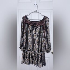 Free People Boho Peasant Dress Size Large Sheer Floral Metallic Thread Tiered