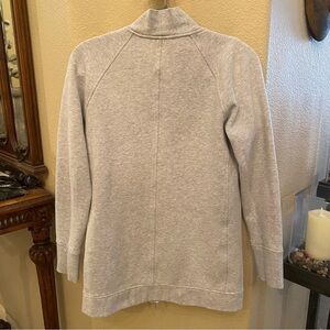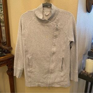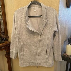 Pre-owned in great condition with no rips or stains. Women’s light gray Back To It Wrap zipped jacket. Great everyday wear. Missing size and material tag inside. Looks like it fits a size 8. Please check measurements. Comes from smoke and pet free home.