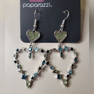Charming heart-shaped earrings with sparkling green and blue stones. Ideal for a stylish look.