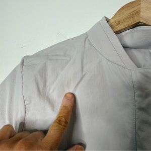 In good used condition. A stain is shown on the shoulder and near the cuff. Light wear throughout.
