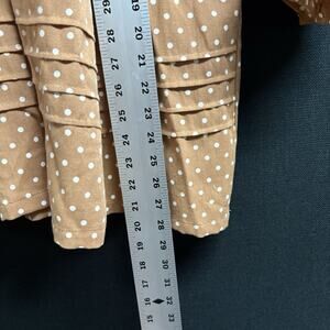 This adorable polka dot mini dress from Entro brings playful charm with a boho twist. Featuring a soft camel-tan base with white dots, it has a flattering V-neck front and back, a tie at the neckline, and feminine pintuck pleats on the bodice and hem. The flowy fit and gathered 3/4 sleeves make it comfortable for everyday wear—perfect as a short dress or tunic-style top with leggings or jeans.