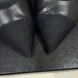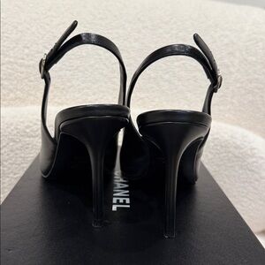 Elegant black slingback heels. Sleek design with pointed toe. Iconic CHANEL branding on insole.