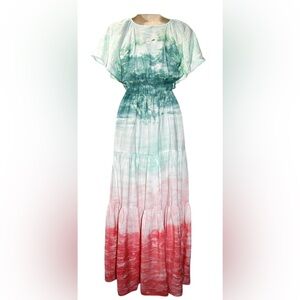 Effortless boho maxi dress by YFB – Young Fabulous & Broke. Features a flattering deep V neckline with adjustable tie detail, flutter sleeves, and a smocked elastic waist that creates a beautiful flowy silhouette. Soft tie-dye pattern fades from mint green to blush coral for an easy summer look. Lightweight and comfortable with an airy drape.
