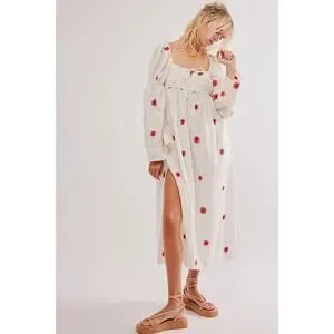 Free People Emory Embroidered Midi Dress White/Red S/P A001147