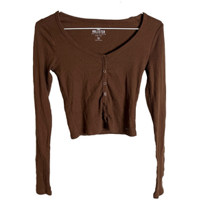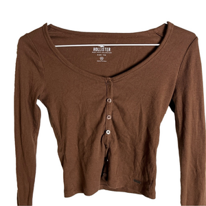 Vintage Hollister chocolate brown button-down baby tee with cropped styling. Classic Y2K era piece perfect for 2000s nostalgia. Fitted silhouette with long sleeves and preppy Hollister aesthetic. Great for layering or wearing alone. Size XS. Good vintage condition with a small mark on the back (see photos). Approximate measurements: Pit to pit: 13 inches Waist: 11.5 inches Length: 14 inches Sleeve Length: 23 inches #vintagehollister #brownbabytee #buttondown #croptop #sizeXS #y2kfashion #2000sstyle #preppy #croppedshirt #nostalgic #babytee #vintagetee