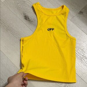Vibrant yellow tank top with Off-White branding. Simple and stylish design.