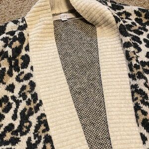 Leopard print cardigan sweater with a fuzzy texture. Features a blend of black and cream tones. Perfect for layering. Medium, but would definitely fit Large & XL.