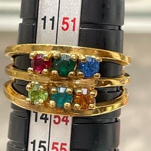 Beautiful vintage mothers Ring 4 bands 6 stores gorgeous gold plated multi gemstone ring featuring a unique double-row design with sparkling faceted stones in a rainbow of colors. This ring looks like a stacked/illusion set and gives a bold, trendy statement while still being easy to wear daily.