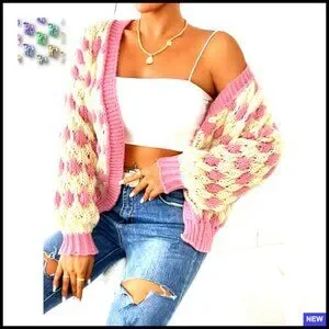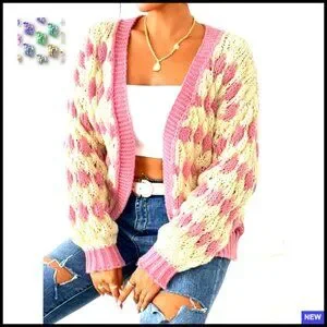 Style: Color block diamond pattern, open front, puff sleeves