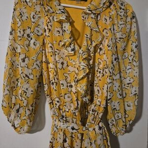 Karl Lagerfeld A-Line Dress, Yellow Floral Print , Ruffle Embellishment , Three-Quarter Sleeve with V-Neck , Sash-Tie Closure at Back