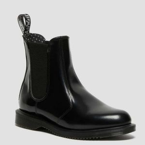 Sleek black ankle boots. Classic Dr. Martens style. Durable and stylish.