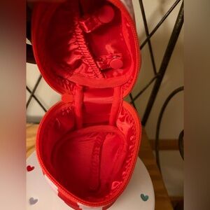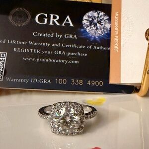 Moissanite Ring size 8, 2 Carat, Silver Plated Metal, Center Stone with Pave Accents. Color D, Gra Certification Included. Comes with MyTagAlongs Peanuts Sweet Hugs Heart Jewelry Case.(approx. 3 1/2”x 4”) Top Zip around closure, top carry handle, 3 snap tabs, interior slip pocket, red lining. NWT.