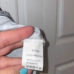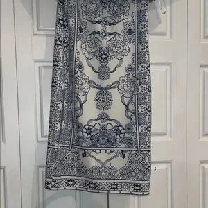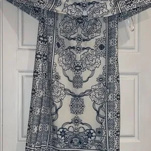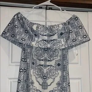 Elegant off-shoulder dress with intricate blue patterns on a white background.