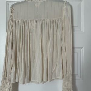 Elegant cream blouse with textured detail. Features long sleeves and tie neckline. Perfect for versatile styling.