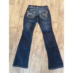 Ariat Denim Bootcut Jeans size 26 Short 26S Womens Boot Western Mid Rise 1963 in a dark wash denim. These jeans feature decorative stitching on the back pockets with an X detail. The front pockets also have subtle stitching accents. A brand tag is visible at the waistband.
