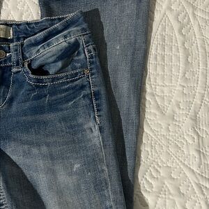 Features a classic faded blue wash w/ rhinestone accents (one rhinestone missing from back left pocket, photos)