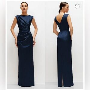 After Six HIGH NECK SLEEVELESS CAP SHOULDER SATIN MAXI DRESS IN MIDNIGHT NAVY Condition is new with tags.