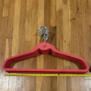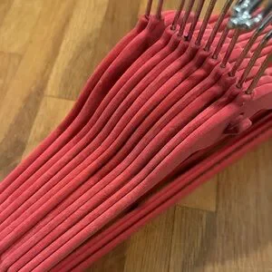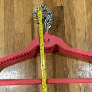 Clutter Free | Set: 12 shirt & 12 universal flocked hangars. Coral color. Integrated cascading hook. Notched shoulders. Anti-slip velvet construction. Purchased from QVC. There are some flaws in hangars from wear of the material and scuffs. Great used condition!