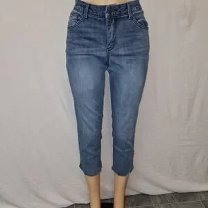 Democracy Chic cropped jeans with a classic blue wash. This image shows a pair of women's blue denim capri jeans with a frayed hem.This is a pair of women's "Style & Co" relaxed fit capri jeans Features a comfortable fit and stylish design. is used in great condition 69% cotton 30% colmax polyester 1% spandex