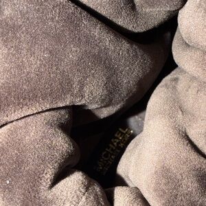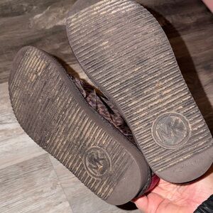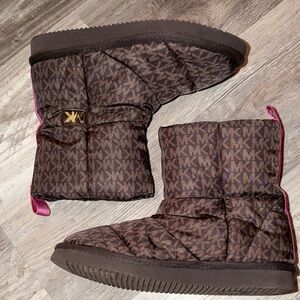 Chic dark brown boots featuring Michael Kors monogram. Accented with pink trim and gold detail.
