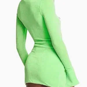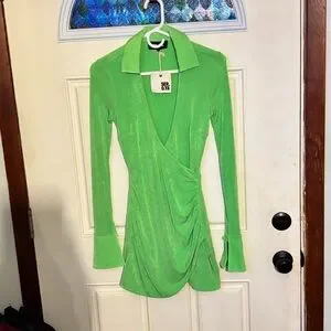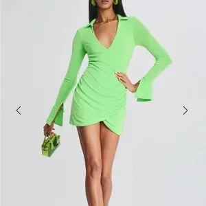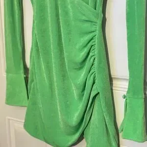 Vibrant green mini dress. Wrap style with long sleeves. Flared cuffs add flair.