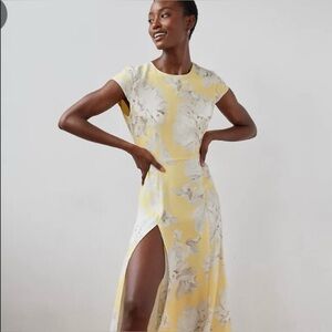 This yellow and white floral Aritzia Babaton midi dress is gorgeous!!! With cap sleeves, thigh slit and slight openings on the back, you will look and feel elegant and stylish. 100% polyester. Size 4