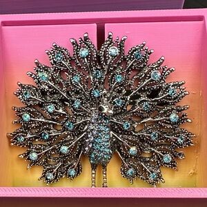 Elegant peacock brooch featuring sparkling blue and silver accents. Perfect for adding a touch of glamour.