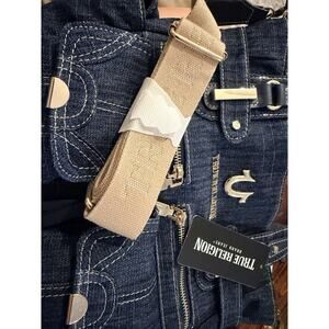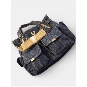 The product is a True Religion dark blue denim shoulder bag with white stitching and silver hardware accents. It features a rectangular shape with a medium size, adjustable shoulder strap, and pockets. The bag has a magnetic snap closure, double shoulder straps in beige, and a black interior lining made of polyester and cotton. Its exterior is crafted from denim with a brushed finish, making it a stylish and versatile option for casual or travel occasions. It also includes the brand's logo stitching as a unique accent.