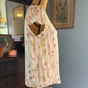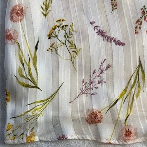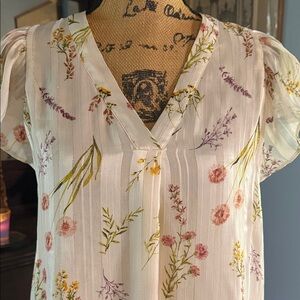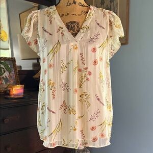 Beautiful Cupcakes and Cashmere blouse featuring a soft ivory base with a delicate botanical floral print in muted blush, yellow, lavender, and green tones. Made from a lightweight, airy chiffon-style fabric with subtle vertical texture and metallic threading for an elevated look.
