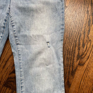 These are pre-owned Thyme maternity jeans, size Large. They feature a light blue denim with a gray, stretchy belly panel. The jeans have a regular fit and a button closure. There are some distressed details, including small rips and frayed hems. The material shows some signs of wear, but overall the jeans are in good, functional condition.