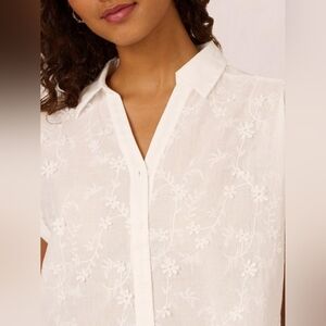 Chic white button down with floral pattern. Short sleeves and classic collar. Perfect for versatile styling.
