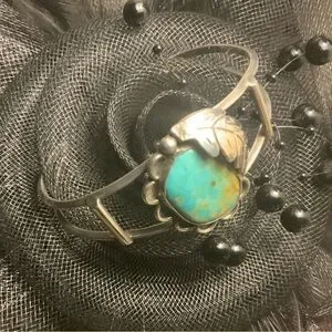♥️🧡Vintage sterling silver Navajo Turquoise and Silver Leaf clamper Bracelet.