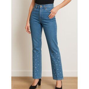 • Color: Classic medium blue wash with floral/star lower-leg print
