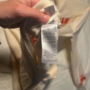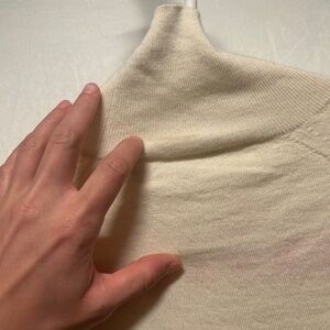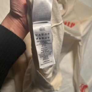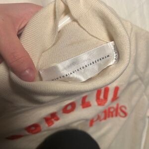 The Victoria Beckham 100% wool cream red city embroidered turtleneck sweater is a luxurious and stylish piece perfect for the winter and fall seasons. Made from high-quality wool with a tight-knit fabric, this sweater features a solid ivory color with embroidered city accents, adding a touch of urban flair to the classic design. The turtleneck and long sleeves provide warmth and comfort, making it ideal for casual occasions. Made by the renowned brand Victoria Beckham, this pullover sweater in size L is a must-have for women looking to add a chic and fashionable statement piece to their wardrobe. good condition. small makeup stain on back of neck as shown in photo.