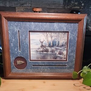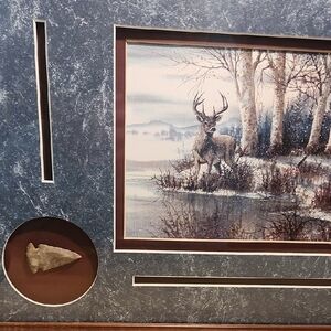 Shadow box with Arrowhead rustic, print picture frame featuring a serene deer scene. The brown frame complements the blue background, adding a touch of nature to your decor.