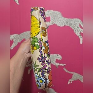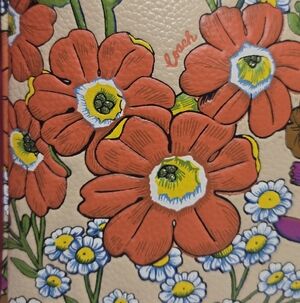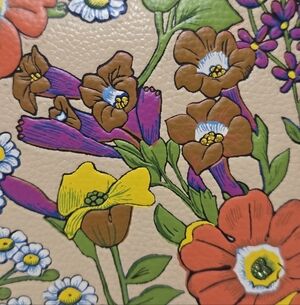 Polished pebble leather, embroider floral print with light sprinkle of glitter that creates some nice 3d look to flowers