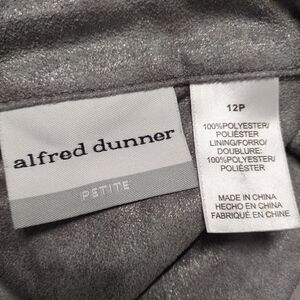 The Alfred Dunner Woman Gray Silver Soft Faux Suede Zip Jacket in size 12P is a stylish and versatile addition to any woman's wardrobe. Made of polyester with a faux suede lining, this basic jacket features a zip closure and convenient pockets. The metallic theme adds a touch of elegance to the gray color, making it a perfect choice for any occasion. This jacket is designed specifically for petites, ensuring a comfortable and flattering fit for women size 12P