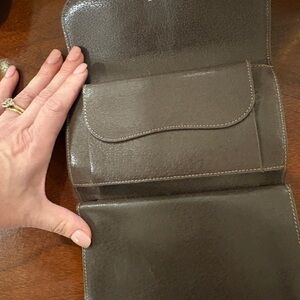 Elegant Gucci wallet with signature monogram. Features red and green stripe with gold emblem.