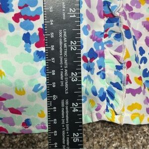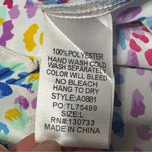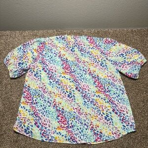 Chic blouse with abstract multicolor design. Features a stylish cut and lightweight fabric. Please see photos for measurements