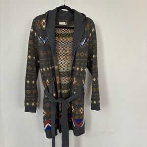 Long lines, belted, pockets, some pilling,separation at the pocket but hardly noticeable, fun design!