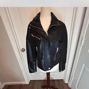 BlankNYC black faux leather moto jacket in women's size Medium. This is a structured, cropped biker-style jacket featuring an asymmetrical zip front, wide moto collar, zippered pockets, and zip cuff details. Preowned in excellent condition as shown.