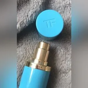 Elegant Tom Ford atomizer in light blue with gold accents. Comes with Elizabeth James Perfume (as shown in photos).