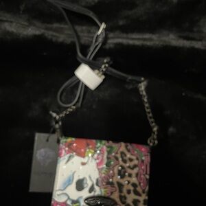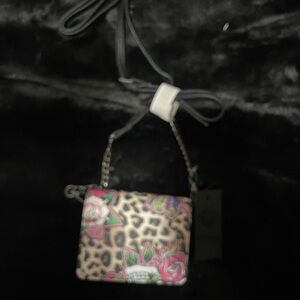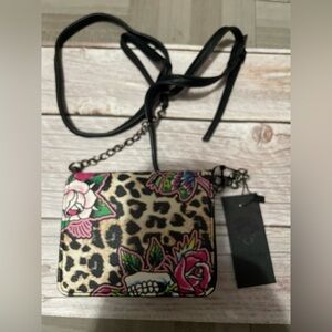 Keywords: Ed Hardy, crossbody, cheetah print, unisex, tattoo design, skulls, roses, wings, micro bag, bold artwork, zipper closure, key ring, casual, festival, new in box.