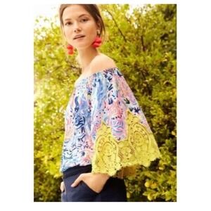 Lilly Pulitzer Zaylee Off The Shoulder Boho Lace Trimmed Tropical Print Top XS