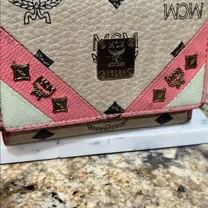 Stylish MCM wallet with pink, cream, and tan design. Features signature logo and gold-tone embellishments.