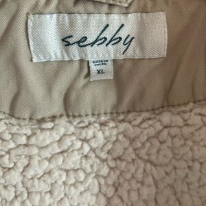 Cozy cream jacket with soft sherpa lining. Features a hood for added warmth.