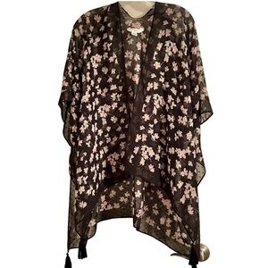 LC Lauren Conrad Black Pink Floral Sheer Kimono Open Front Tassel OS