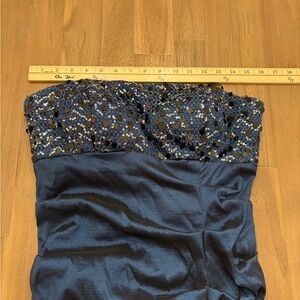This stunning strapless evening gown features a rich midnight blue color, perfect for any formal occasion such as prom! There’s a super cute small slit in the skirt too! This dress is nearly perfect except for a small snag at the bottom of the zipper (zipper works perfectly). The dress is a size 13 and was made in the USA! The color on the mannequin is the most accurate color.