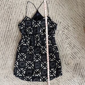 Stylish mini dress with geometric pattern. Features thin straps and a fitted waist. Perfect for casual outings.